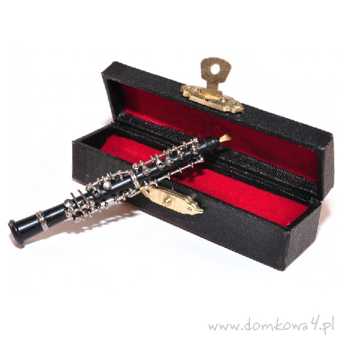 Miniaturowy obój w kolorze czarnym ze srebrnymi elementami. Całość zapakowana w czarny futerał wyłożony w środku czerwonym aksamitem z wytłoczką dopasowana pod kształt saksofonu. Całość prezentuje się niezwykle elegancko.