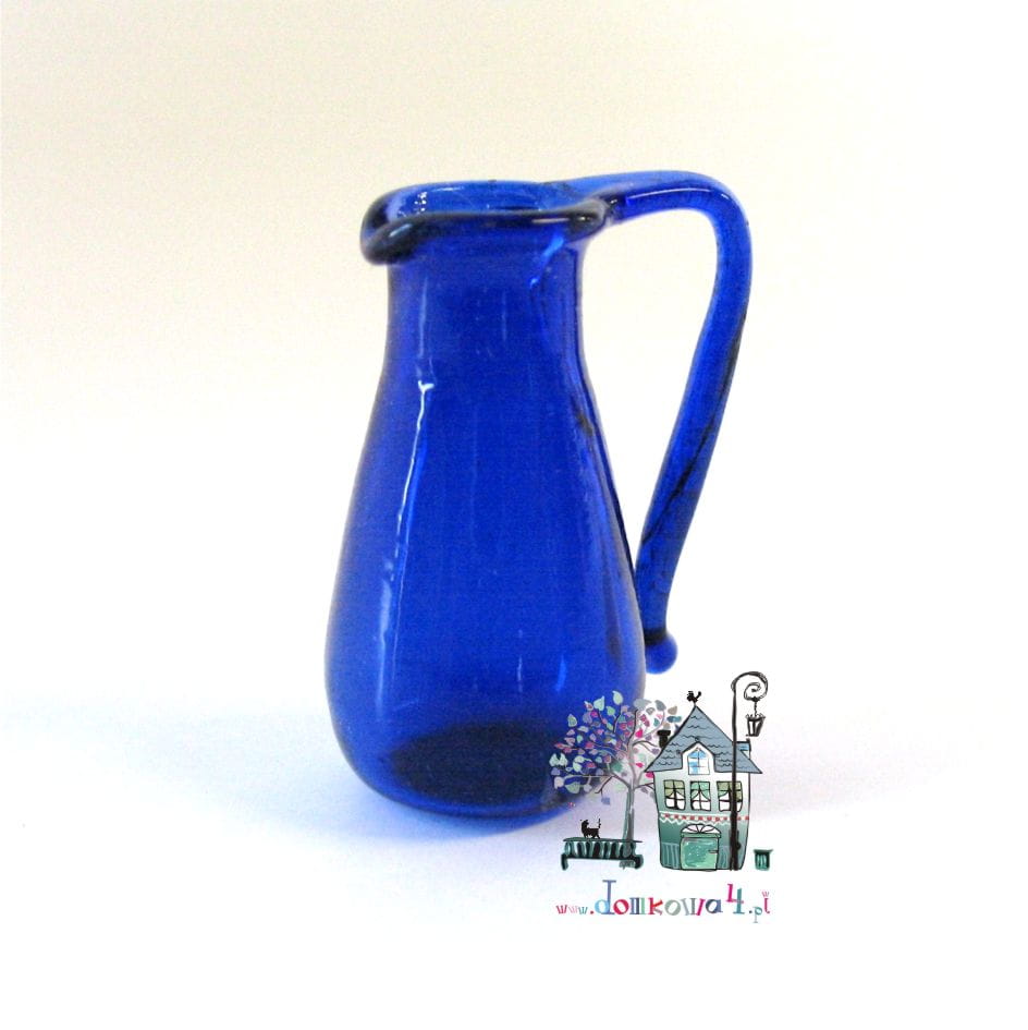 Wysoki, szklany niebieski dzban. Wersja miniaturowa.