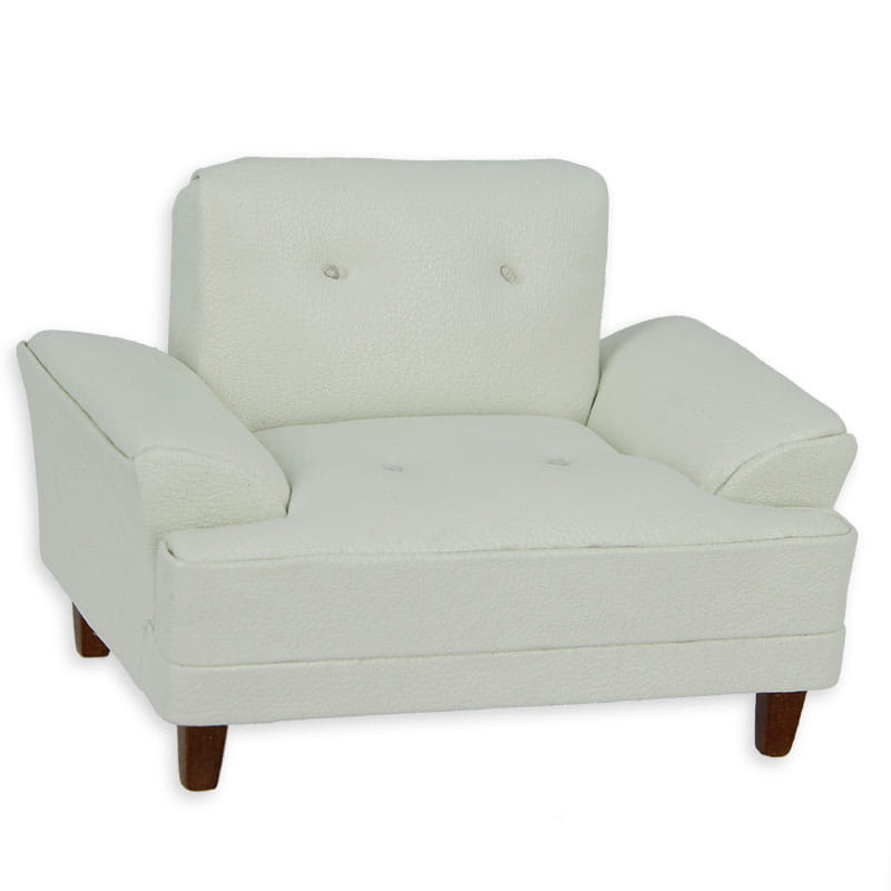 Miniaturowy fotel obity białą delikatną skórą. Całość bardzo szlachetna i starannie wykonana. Fotel posiada delikatne pikowania na całej powierzchni siedzącej. Nogi mebelka wykonane z drewna. Idealne dopełnienie salonu w domku dla lalek.