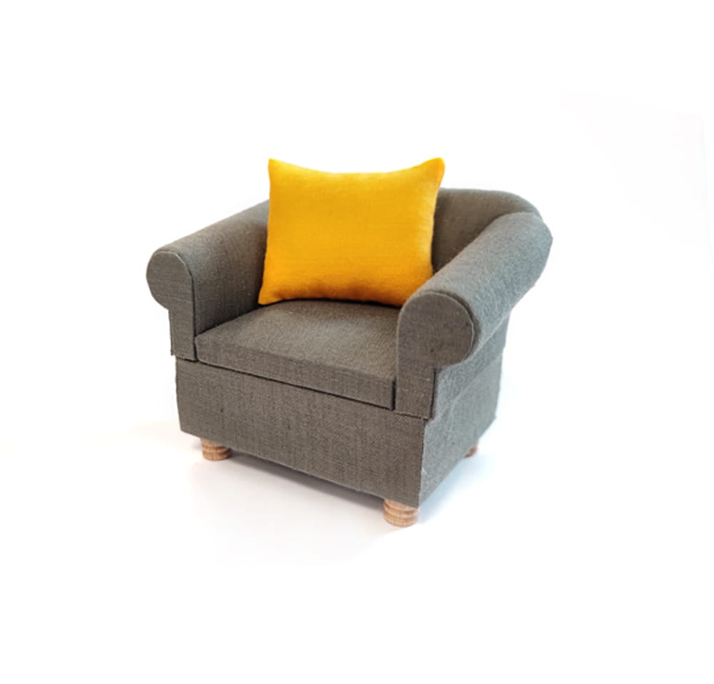 Obicie fotela wykonane jest z szarego materiału. Poduszka dołączona do fotela jest zdejmowana. Mebelek idealnie uzupełni wystrój salonu w domku dla lalek.
