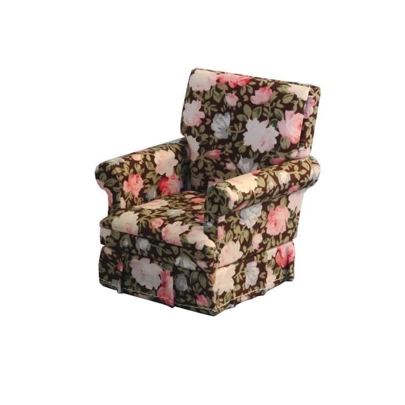 Miniaturowy fotel obity ciemnym materiałem w kwiaty. Oparcie i siedzisko fotela jest miękkie. Mebelek będzie świetnym uzupełnieniem salonu w domku dla lalek.