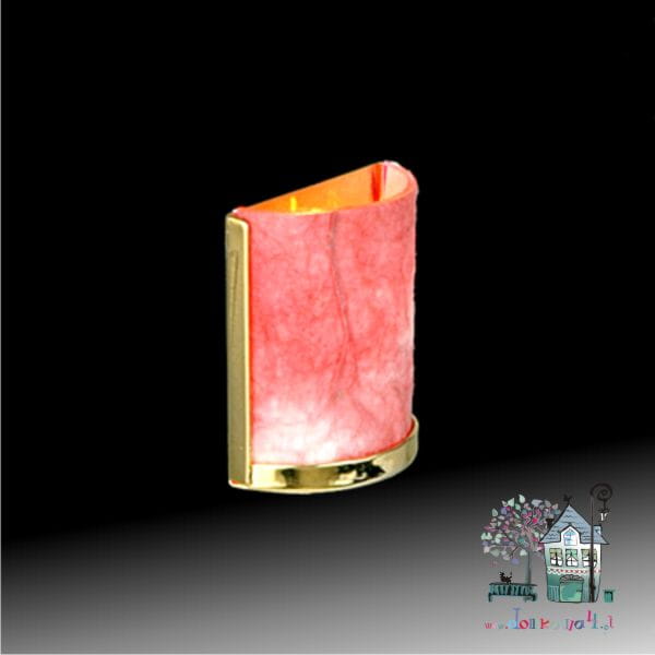 Różowy, miniaturowy kinkiet półokrągły. Klosz wykonany z przeźroczystego tworzywa i oklejony papierem rózowym z fakturą. Okucia kinkietu metalowe w kolorze błyszczącego złota.