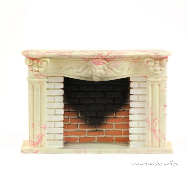 Miniatura dużego kominka wykonana z utwardzonej masy plastycznej. Miejsce paleniska pomalowane na kolor imitujący cegły. Poprzez zastosowanie efektu przydymienia, kominek doskonale będzie prezentował się w salonie domków dla lalek.