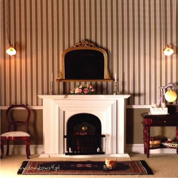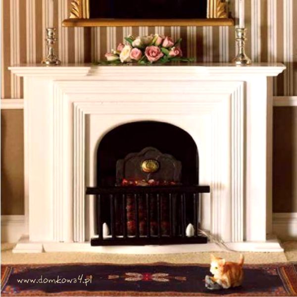 Miniaturowy, biały kominek wykonany z drewna z wnętrzem w kolorze czarnym. W komplecie znajduje się czarna balustrada.