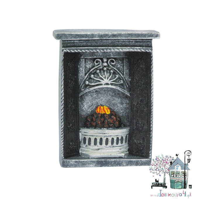 Miniaturowy kominek w kolorze metalicznym. Wnętrze ozdobione motywem kwiatowym.