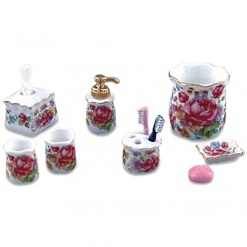 Porcelanowy komplet łazienkowy. W skład zestawu 8 elementów widocznych na zdjęciu. Całość ozdobiona jest motywek kwiatowym i złotymi wykończeniami brzegów.