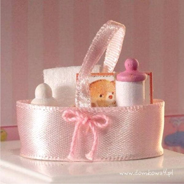 Miniatura koszyczka z akcesoriami dziecięcymi. Zawartość koszyka to dwie atrapy pojemników i klocki z nadrukiem liter A B C.