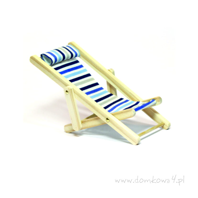 Miniaturowy, składany drewniany leżak plażowy z płótnem w białe, granatowe i niebieskie pasy. U góry posiada także miękki zagłówek. Wykonany z surowego drewna, które ładnie współgra z różnokolorowym materiałem.