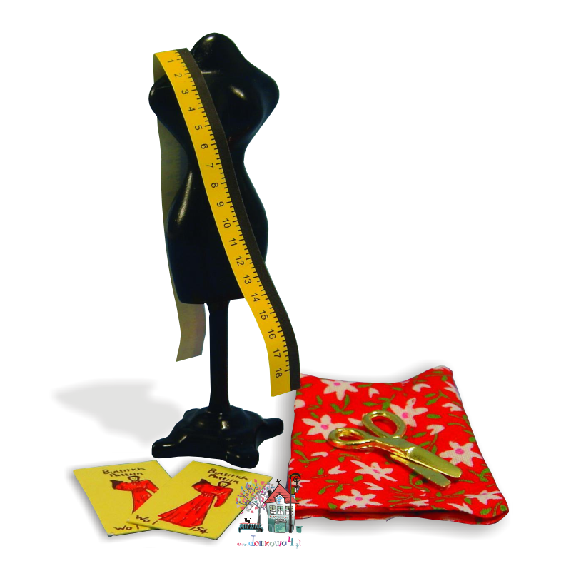 Miniaturowy manekin krawiecki czarny z dodatkami. Manekin wykonany z metalu i polakierowany na czarno. Bardzo ładny komplet który może być uzupełnieniem pracowni krawieckiej czy kącika z maszyna do szycia w domku lalek.