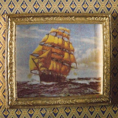 Miniaturowy obraz przedstawiający hiszpański okręt podczas sztormu. Reprodukcja oprawiona w złotą półmatową ramę ze zdobieniami. Idealnie ozdobi salon w domku dla lalek.
