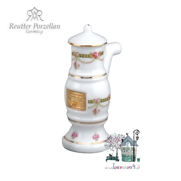 Porcelanowy, okrągły piec pękaty z rurą kominową. Całość z białej porcelany z motywem kwiatów i złotymi wykończeniami. Piecyk będzie pasował do sypialni lub łazienki w domku dla lalek.