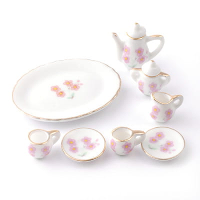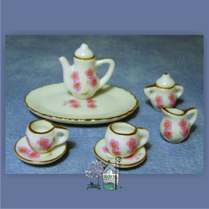 Porcelanowy serwis kawowy dla dwóch lalek. Głównym motywem na porcelanie są rózowe kwiatki.