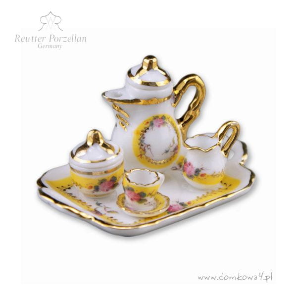 Miniaturowy, porcelanowy serwis kawowy z tacą. Serwis wykonany jest z białej porcelany i ozdobiony bardzo delikatnym, wzorem o zabarwieniu żółtym ze złotymi paskami na krawędziach.