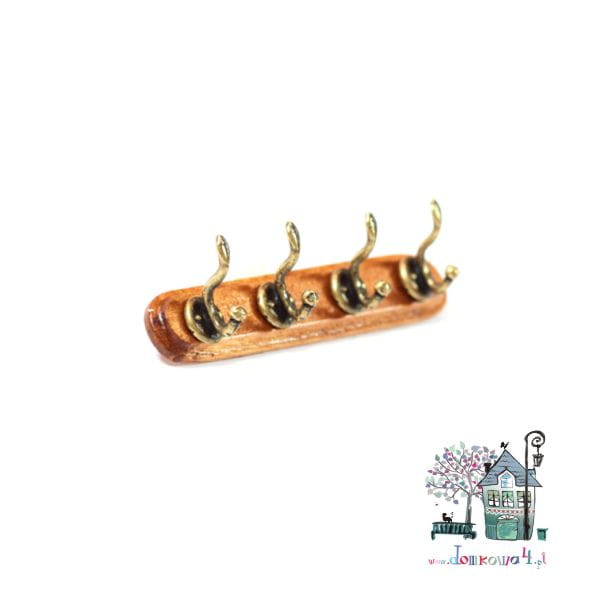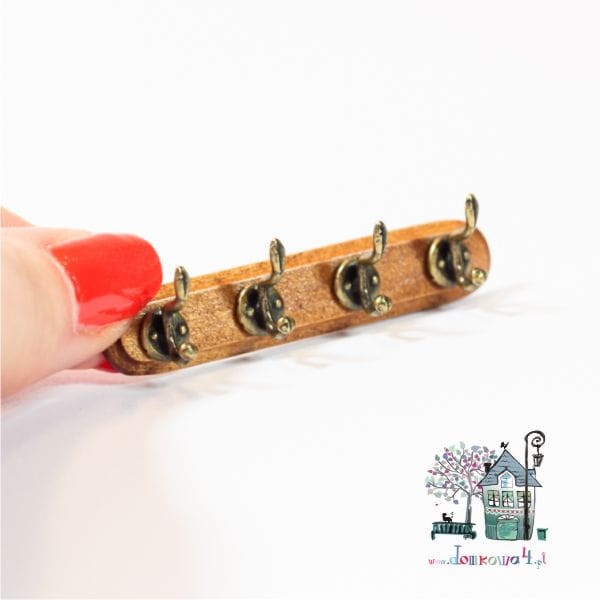 Miniaturowy, poczwórny wieszak do zamontowania na ścianie w domku dla lalek.