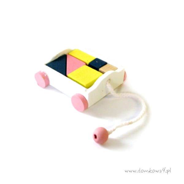 Mini zabawka - drewniany wózek do ciągnięcia z kolorowymi klockami. Całość wykonana z drewna, pomalowana na pastelowe kolory.