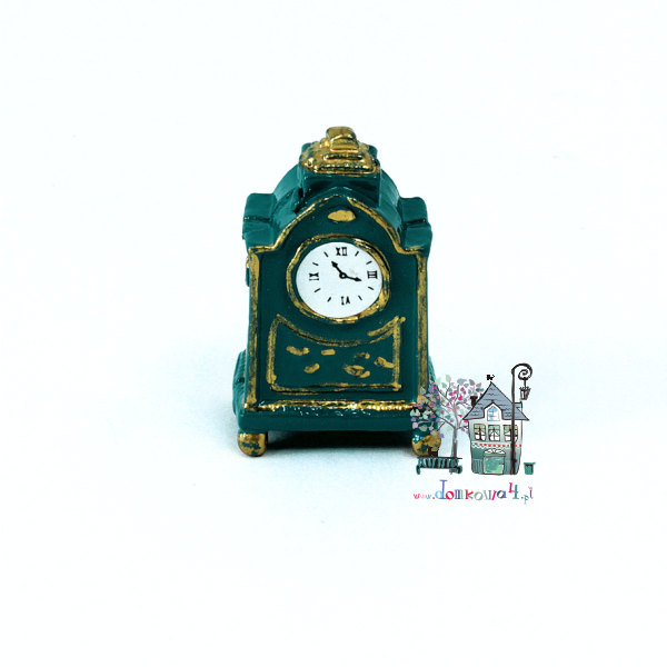 Zegar kominkowy w kolorze morskiej zieleni. Odlany z metalu i pomalowany.