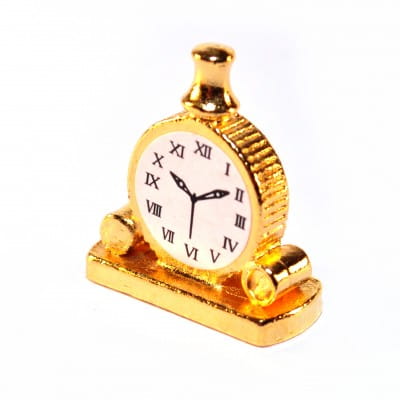 Miniaturowa imitacja zegara stołowego, wykonana z metalu. Po obu stronach zegar posiada przyklejoną, nieruchomą tarczę z cyferblatem.