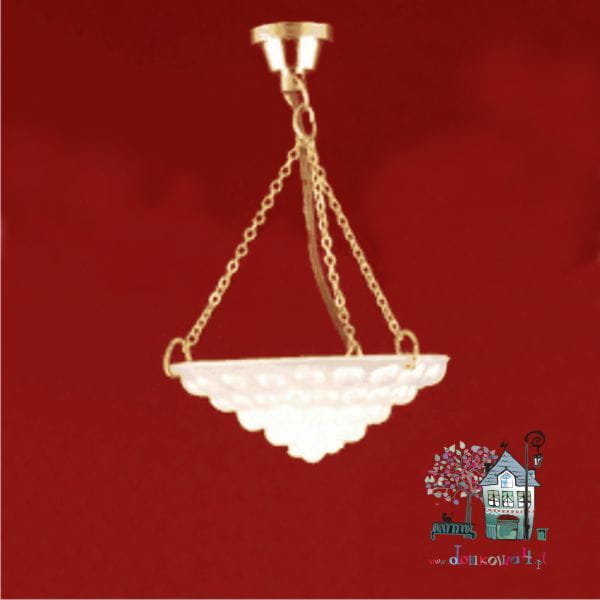 Miniaturowy, pojedynczy żyrandol do domków dla lalek. Żyrandol z okrągłym, stożkowym kloszem z wypukłymi elementami - całość imitująca piaskowane szkło.