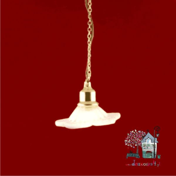 Miniaturowy żyrandol pojedynczy z kloszem skierowanym do dołu. Klosz w kolorze piaskowanego szkła w kształcie rozwiniętego kwiatka.