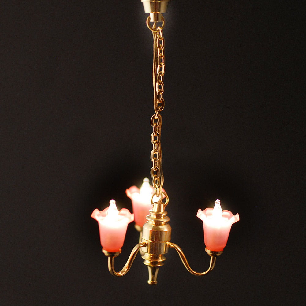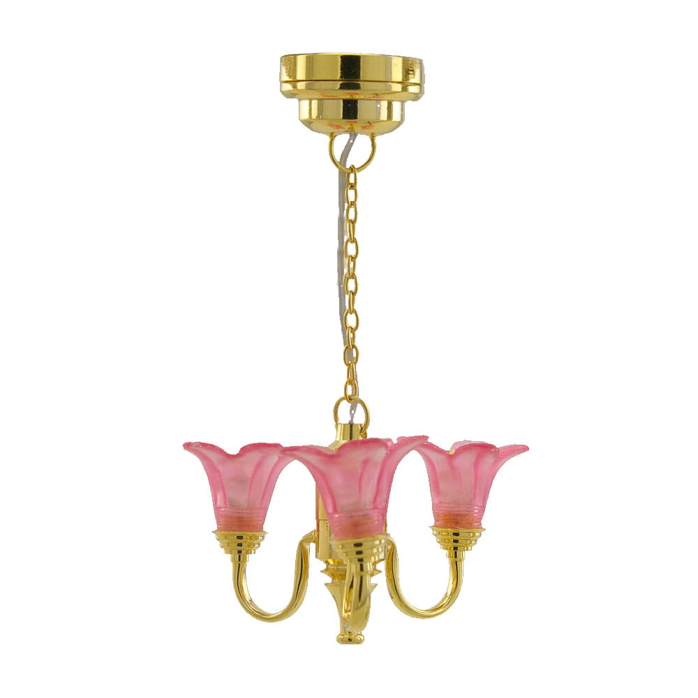 Miniaturowy trójramienny żyrandol skierowany ku górze z nasadzanymi kloszami w kształcie różowych tulipanów. Całość prezentuje się bardzo elegancko i stylowo.