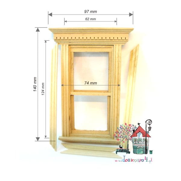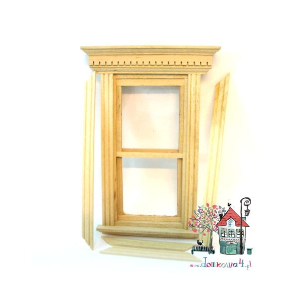 Drewniane okno jednoelementowe w stylu amerykańskim. Okno wykonane jest z surowego liściastego drewna. W zestawie komplet listewek do wewnętrznych wykończeń. Okienko posiada szybki w dwóch niezależnych elementach które przesuwają się pionowo. Całość przystosowana jest do montażu na głębokość ściany do 8 mm.