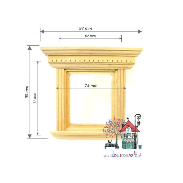 Drewniane, surowe okienko z wstawioną szybką z plexi i ozdobnym gzymsem w górnej części. Całość wykonana z jasnego, liściastego drewna. Okno jest przystosowane do wpustu w ścianę do głębokości 10 mm.