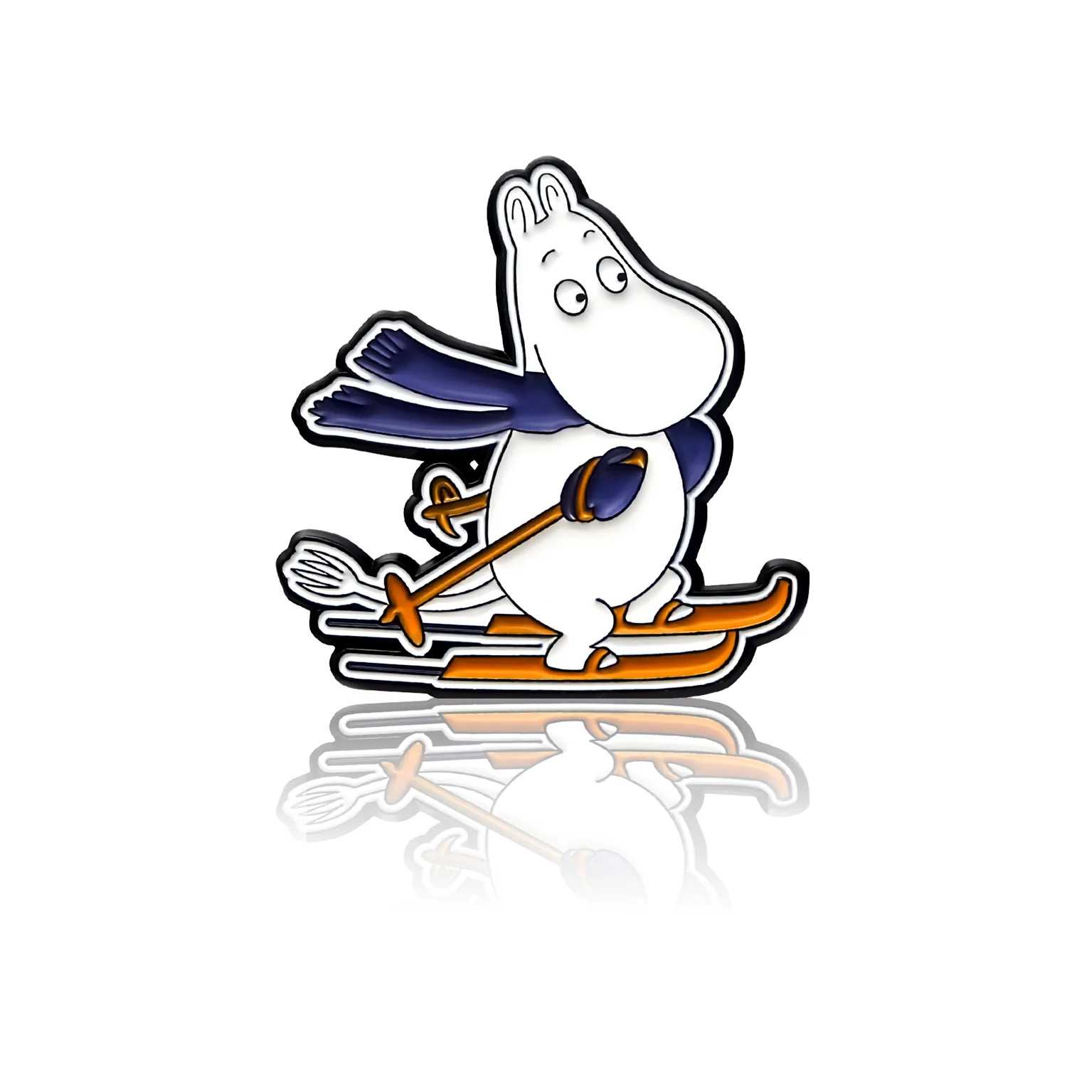 Na przypince widać Muminka w fioletowym szaliku jadącego na nartach.