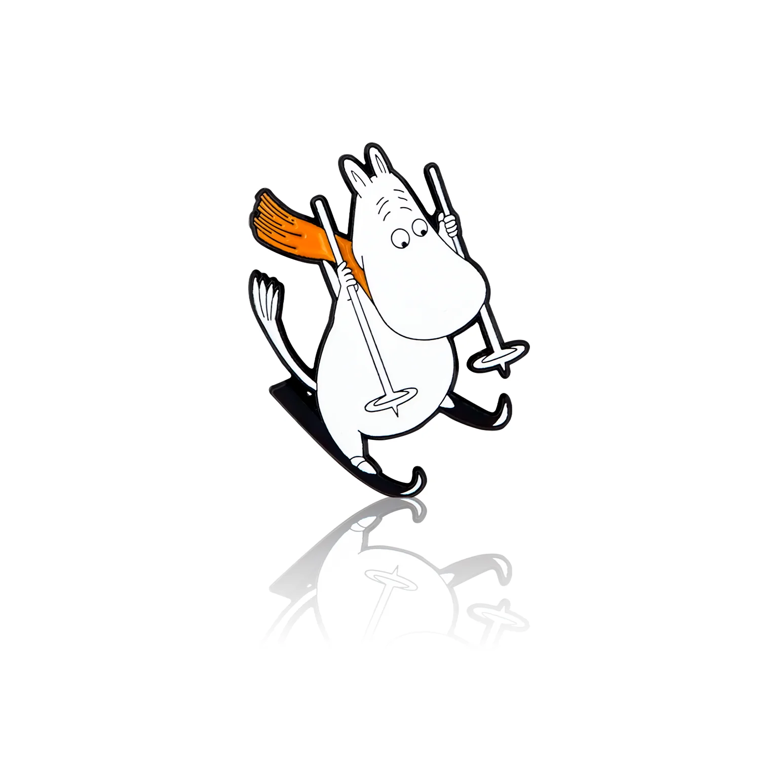 Na przypince widać Muminka w pomarańczowym szaliku jadącego na nartach.
