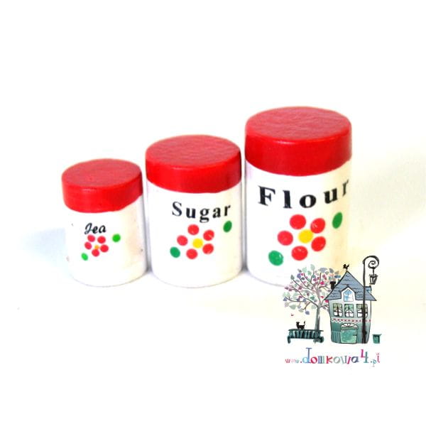 Komplet trzech pojemników kuchennych z naklejkami. Pojemniki są jedynie imitacją bez otwieranych wieczek, wykonana z krążków drewnianych.