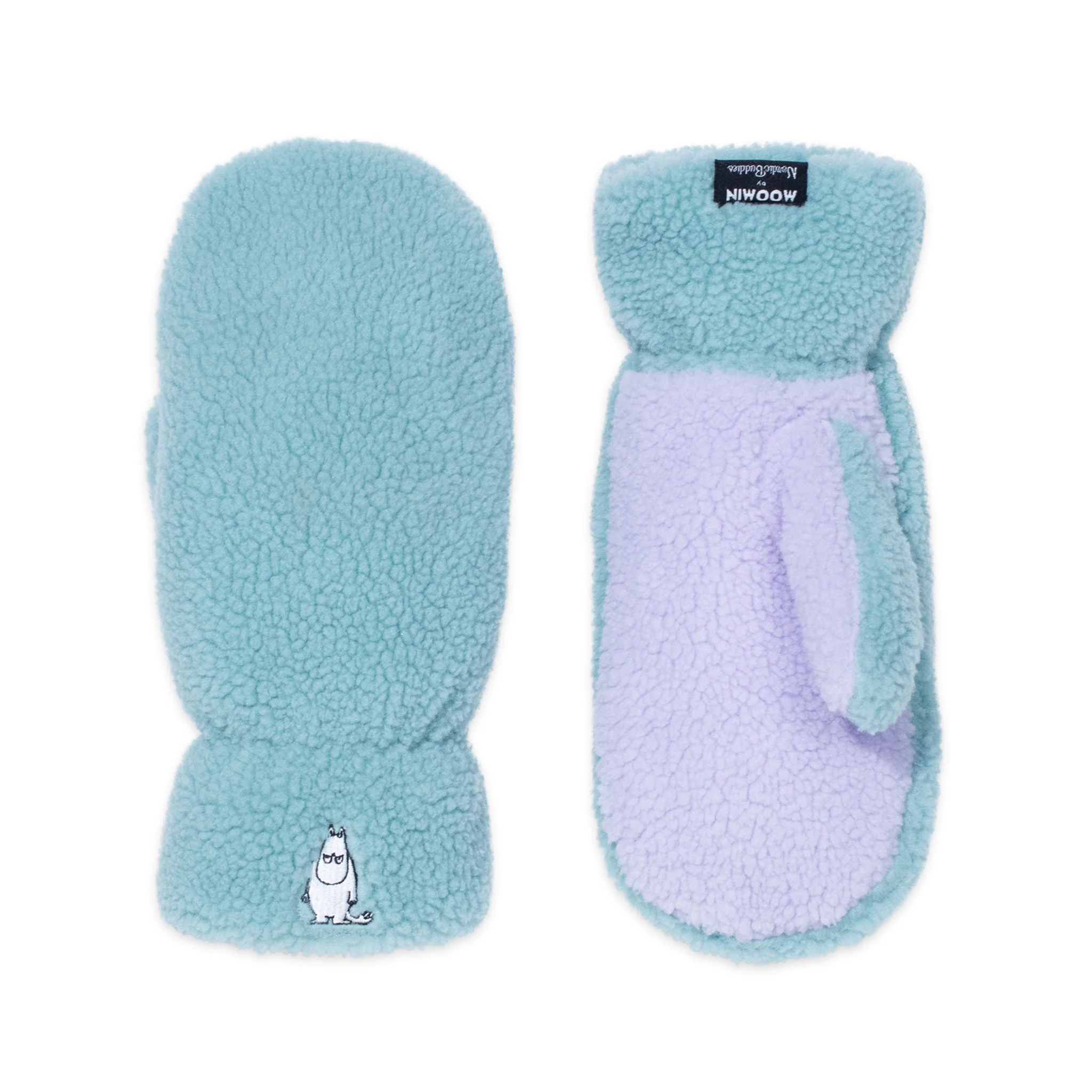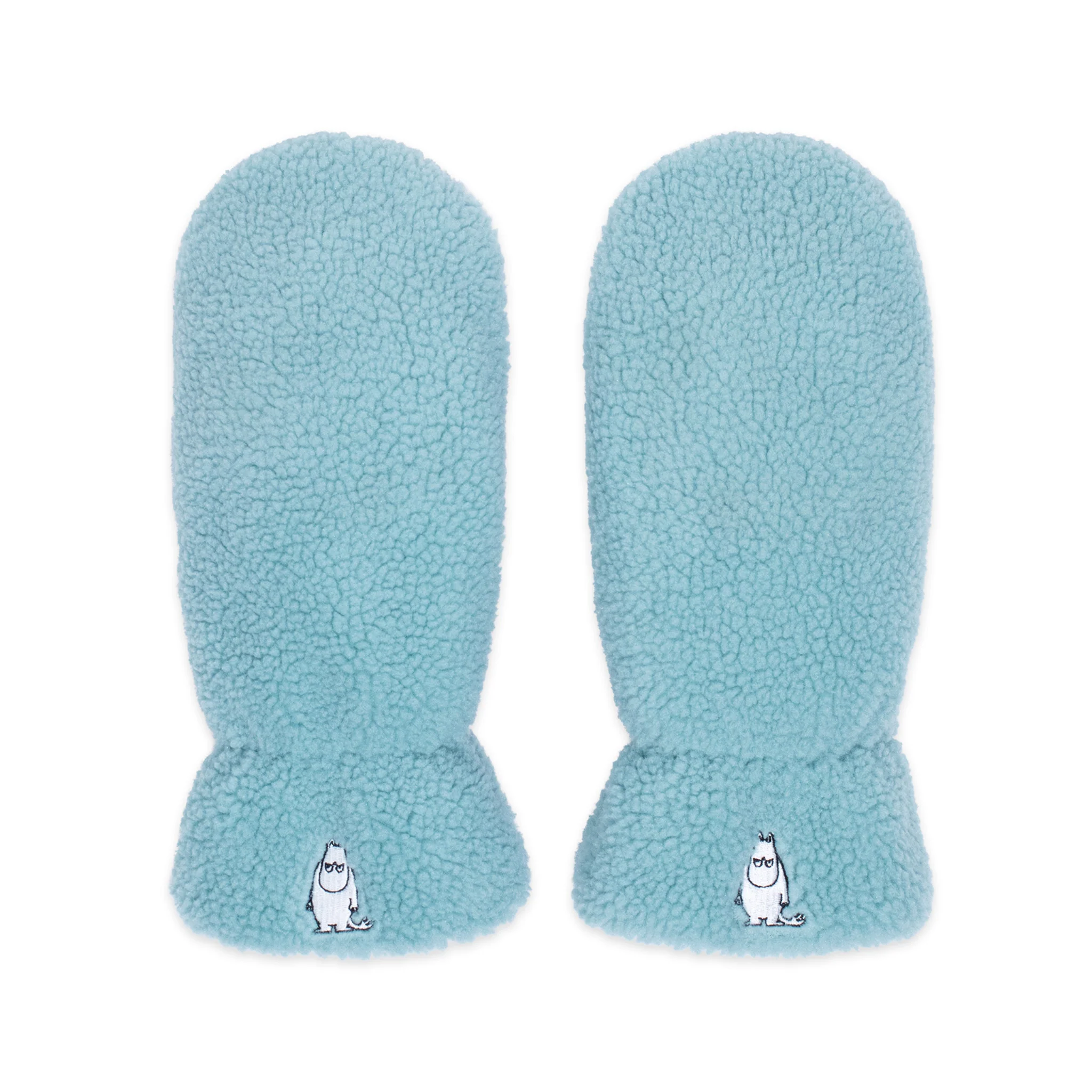 Rękawiczki są w kolorze niebieskim, a w dolnej części każdej z nich wyhaftowana jest postać Muminka.