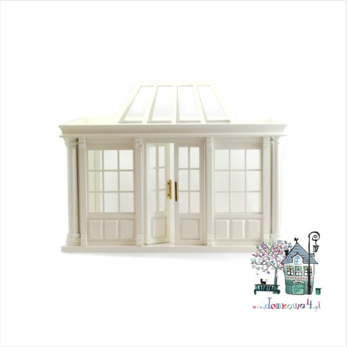 Oranżeria ze świetlikiem, wykonana z MDF-u i drewna. Całość pomalowana na kolor biało-kremowy. Oranżeria posiada podwójne, otwierane drzwi do srodka i na dachu zdejmowany świetlik.