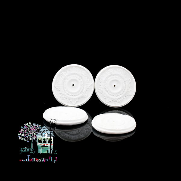 Białe miniaturowe rozety pod żyrandol o średnicy 34 mm w domku dla lalek. W komplecie znajdują się 4 sztuki.
