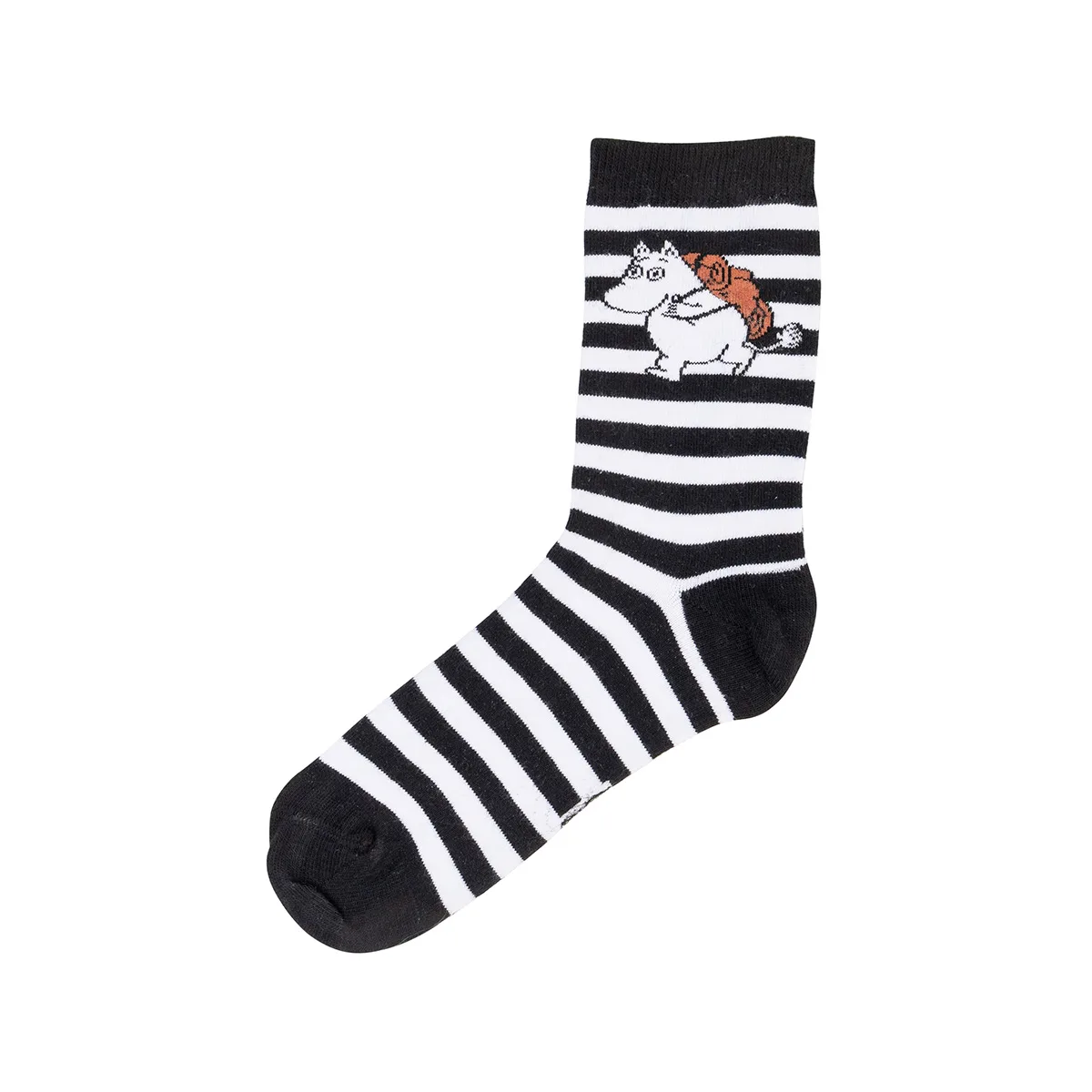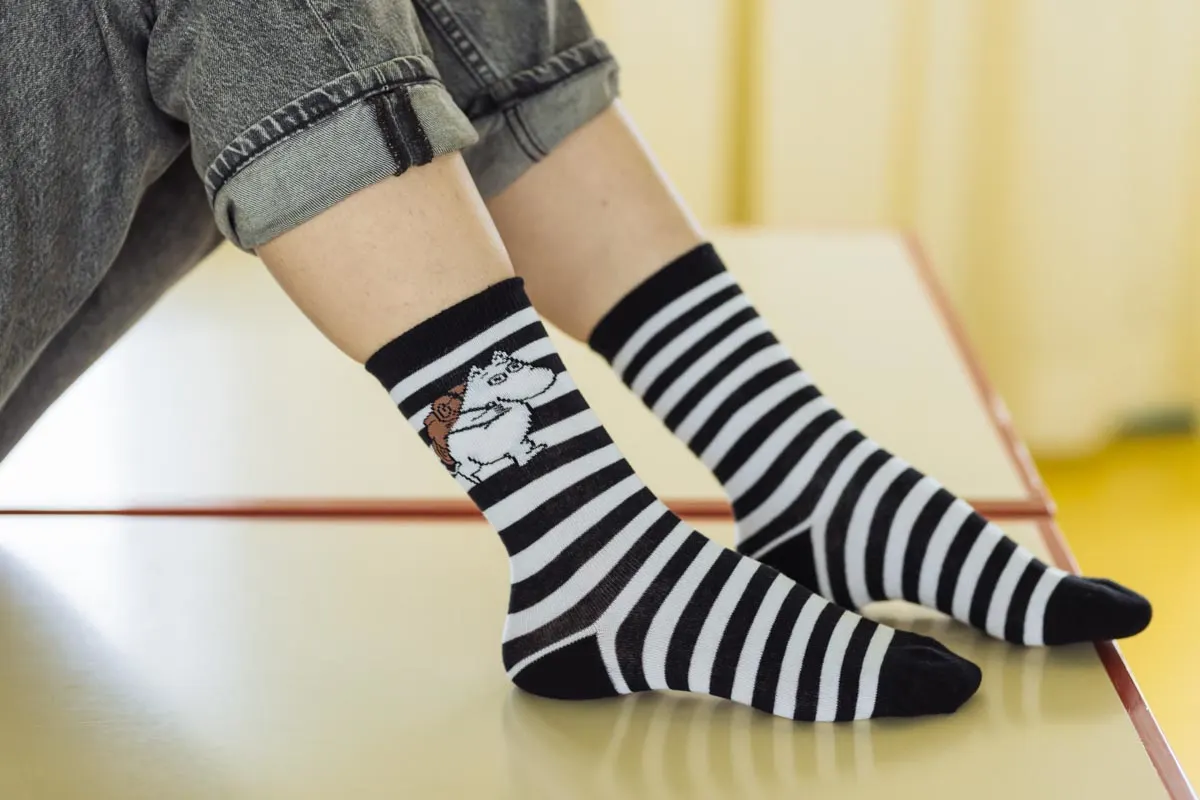 Skarpety w czarno- białe paski z wizerunkiem muminka w górnej części. Posiadają prążkowane wykończenia, które zapobiegają zsuwaniu się skarpet z nóg.