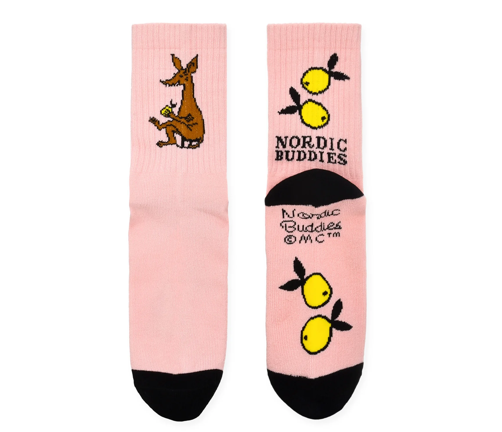 Skarpety są w kolorze jasnoróżowym. W górnej części skarpet wyszyte są postaci bohatera bajki "Muminki" - Ryjka oraz owoce.