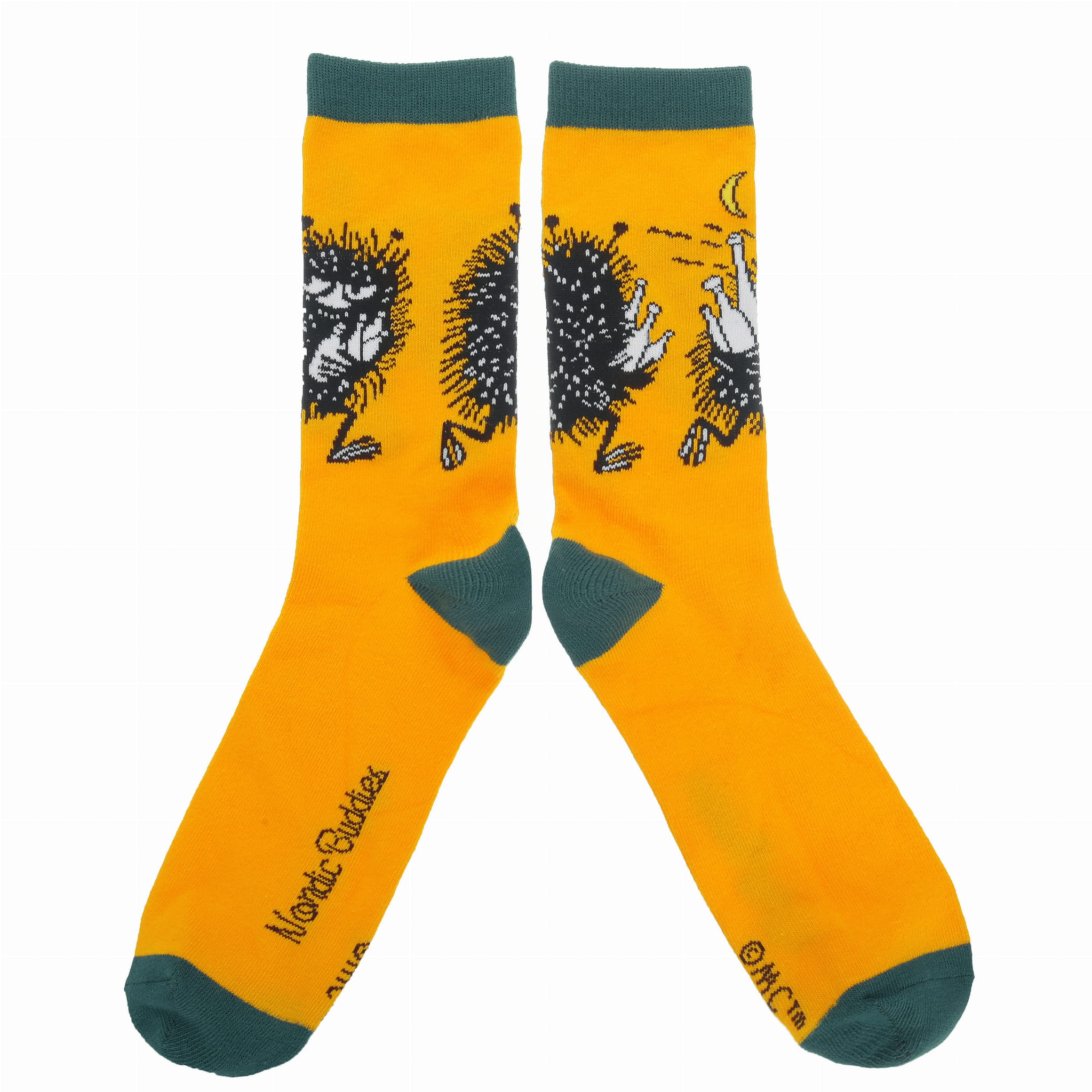 Skarpety są w kolorze żółtym z zielonym wykończeniem. W górnej części widoczne są postacie bohatera bajki "Muminki"- Bobka.