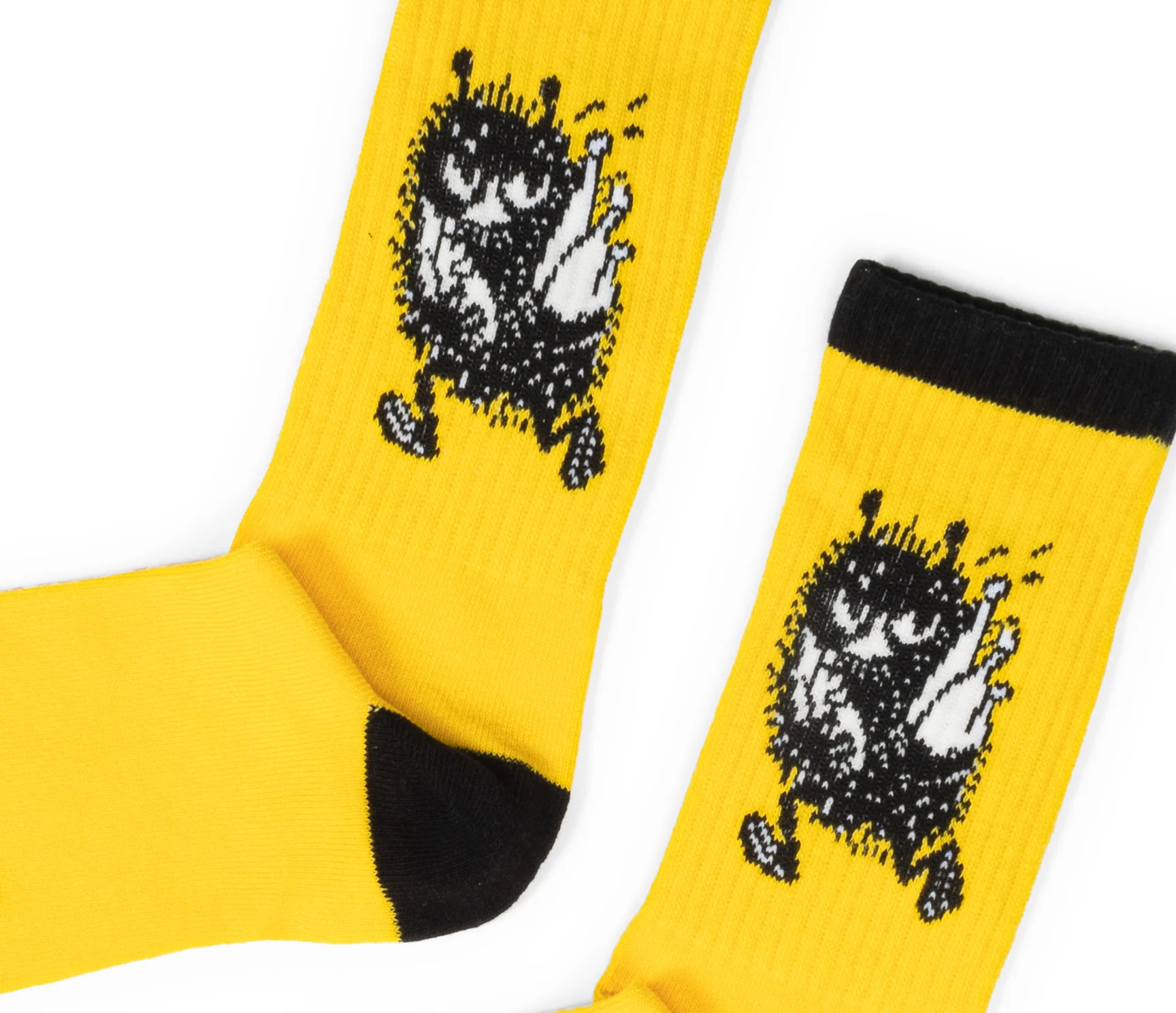 Skarpety są w kolorze żółtym z czarnymi wykończeniami. U góry skarpet wyszyta jest postać bohatera bajki "Muminki"- Bobka.