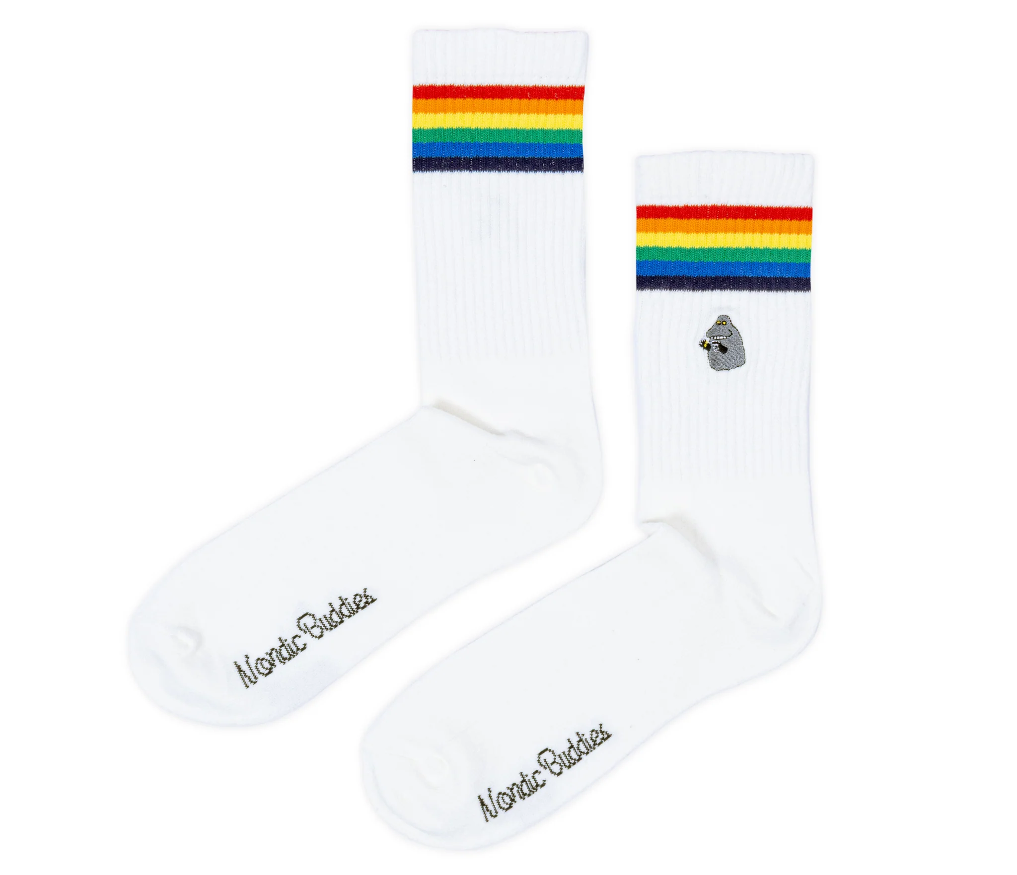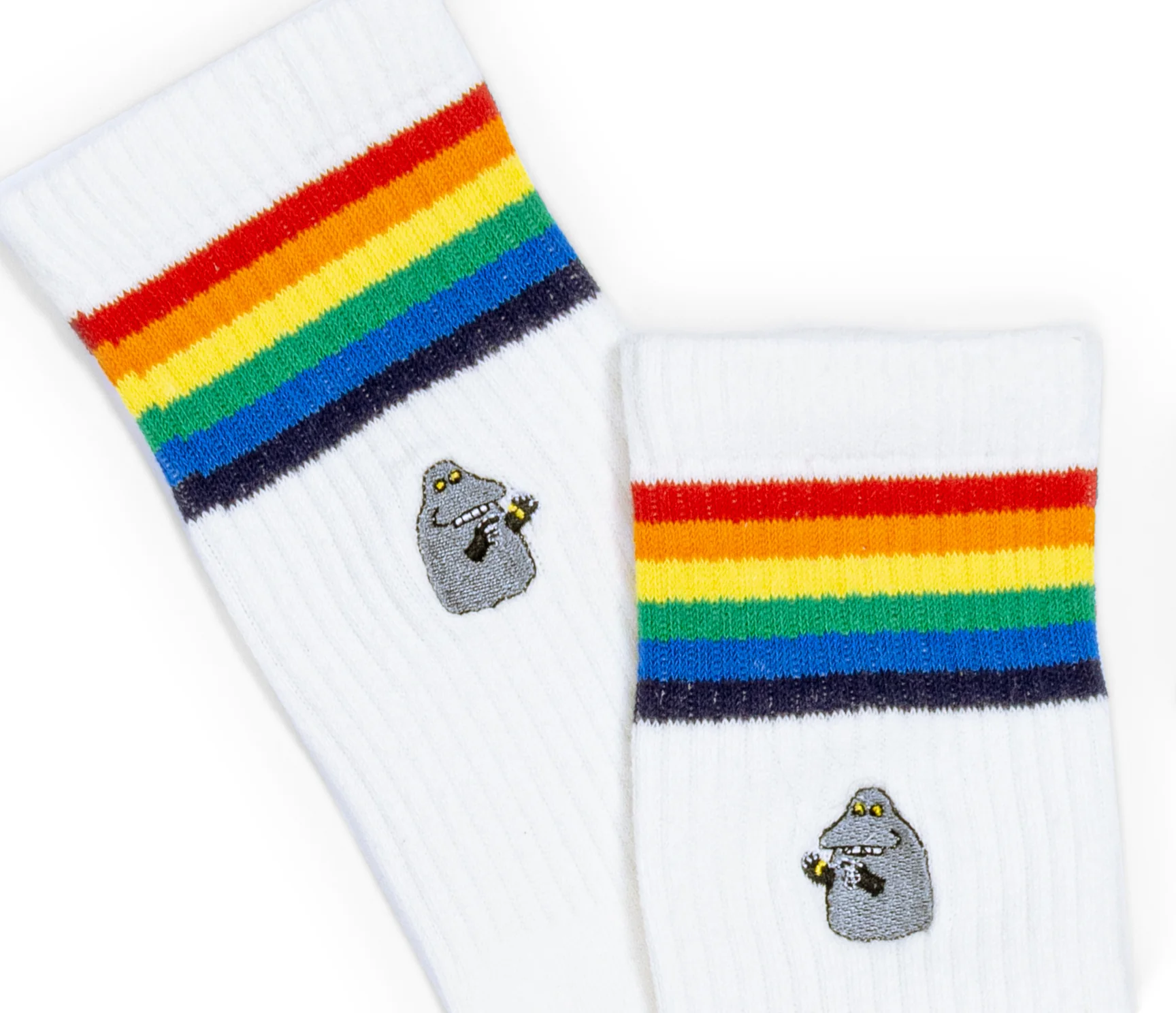 Skarpety są w kolorze białym z tęczowymi paskami w górnej części. U góry skarpet wyhaftowana jest postać bohatera bajki "Muminki"- Buki