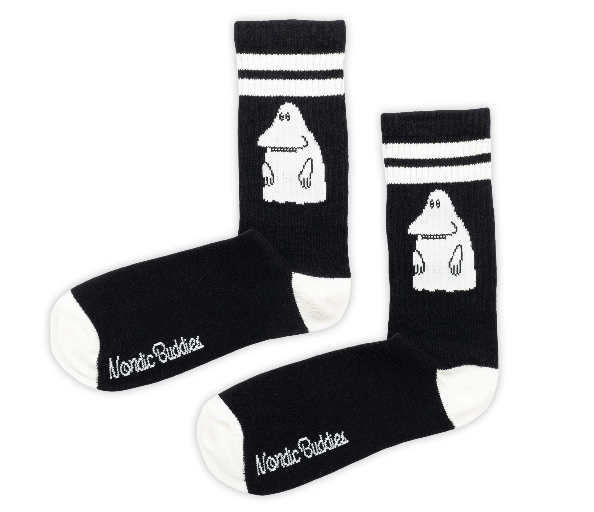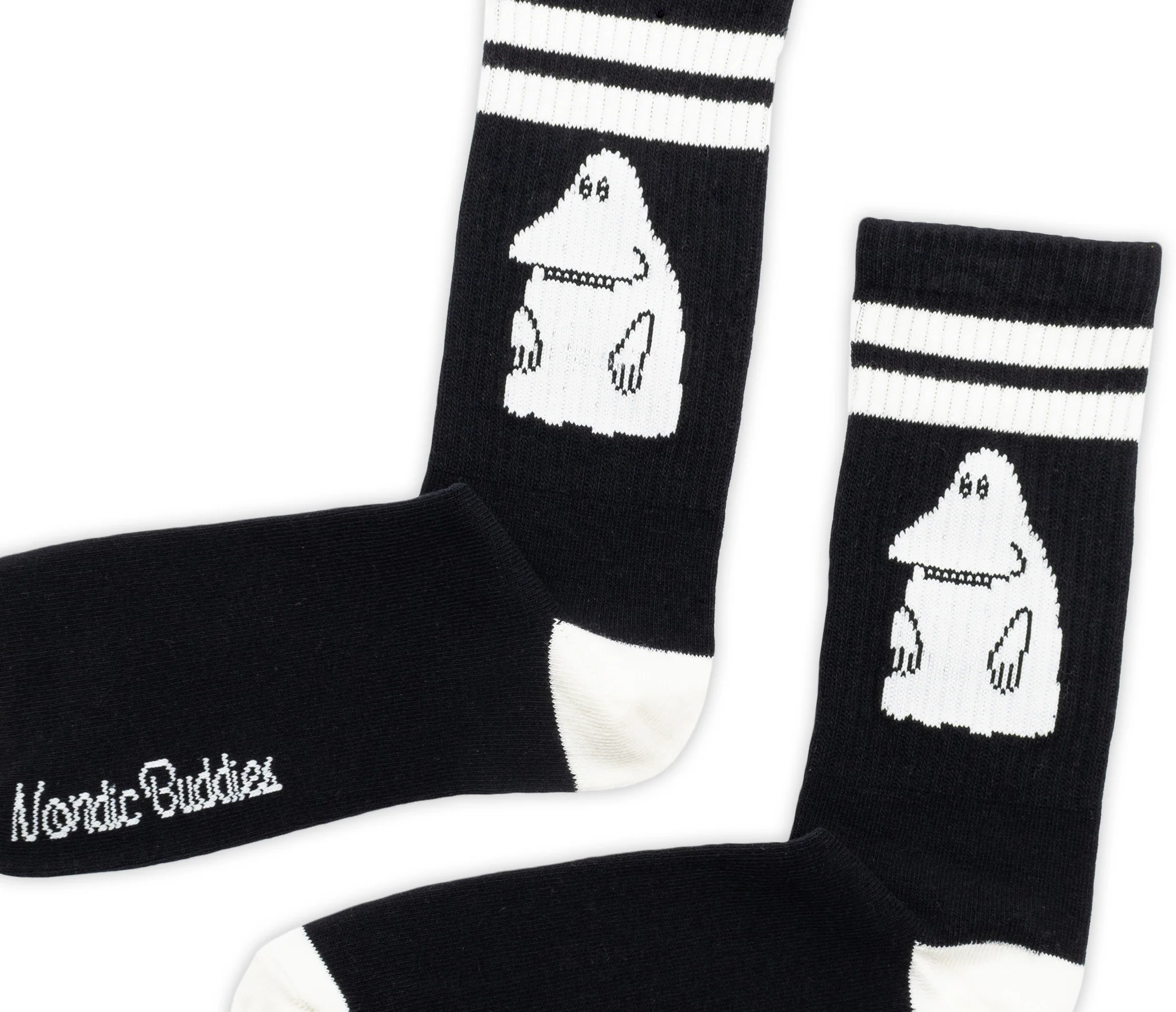 Skarpety są w kolorze czarnym z białymi paskami w górnej części. U góry skarpet wyszyta jest postać bohatera bajki "Muminki"- Buki