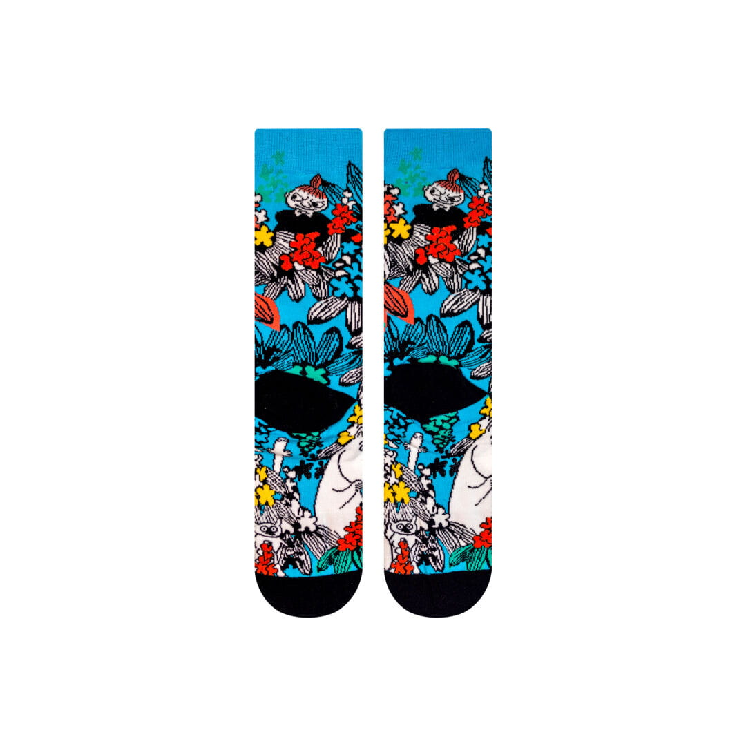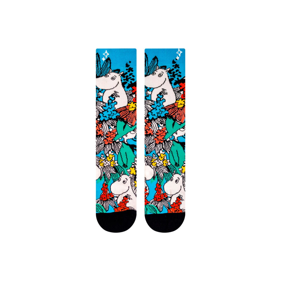 Skarpety są w wielu kolorowych odcieniach, a na całej powierzchni skarpet widoczne są równe postaci bohaterów bajki "Muminki"