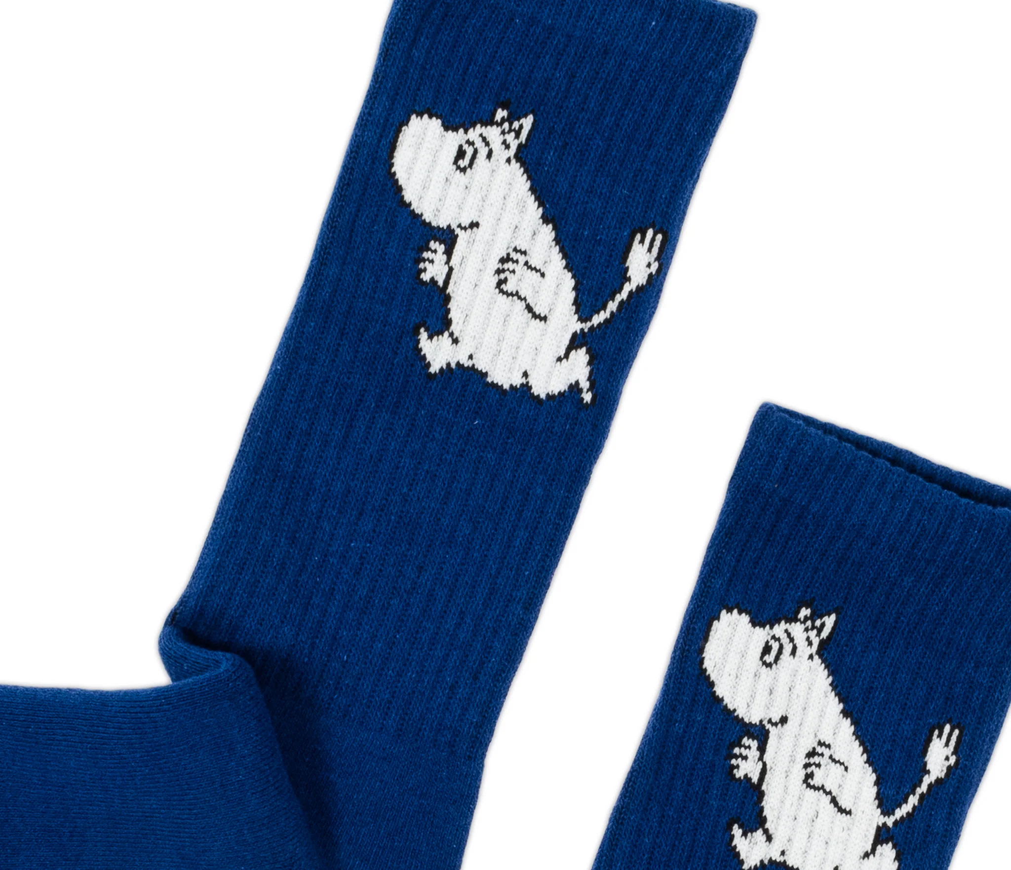 Skarpety są w kolorze granatowym. W górnej części skarpety widoczna jest postać bohatera bajki "Muminki"- Muminka.