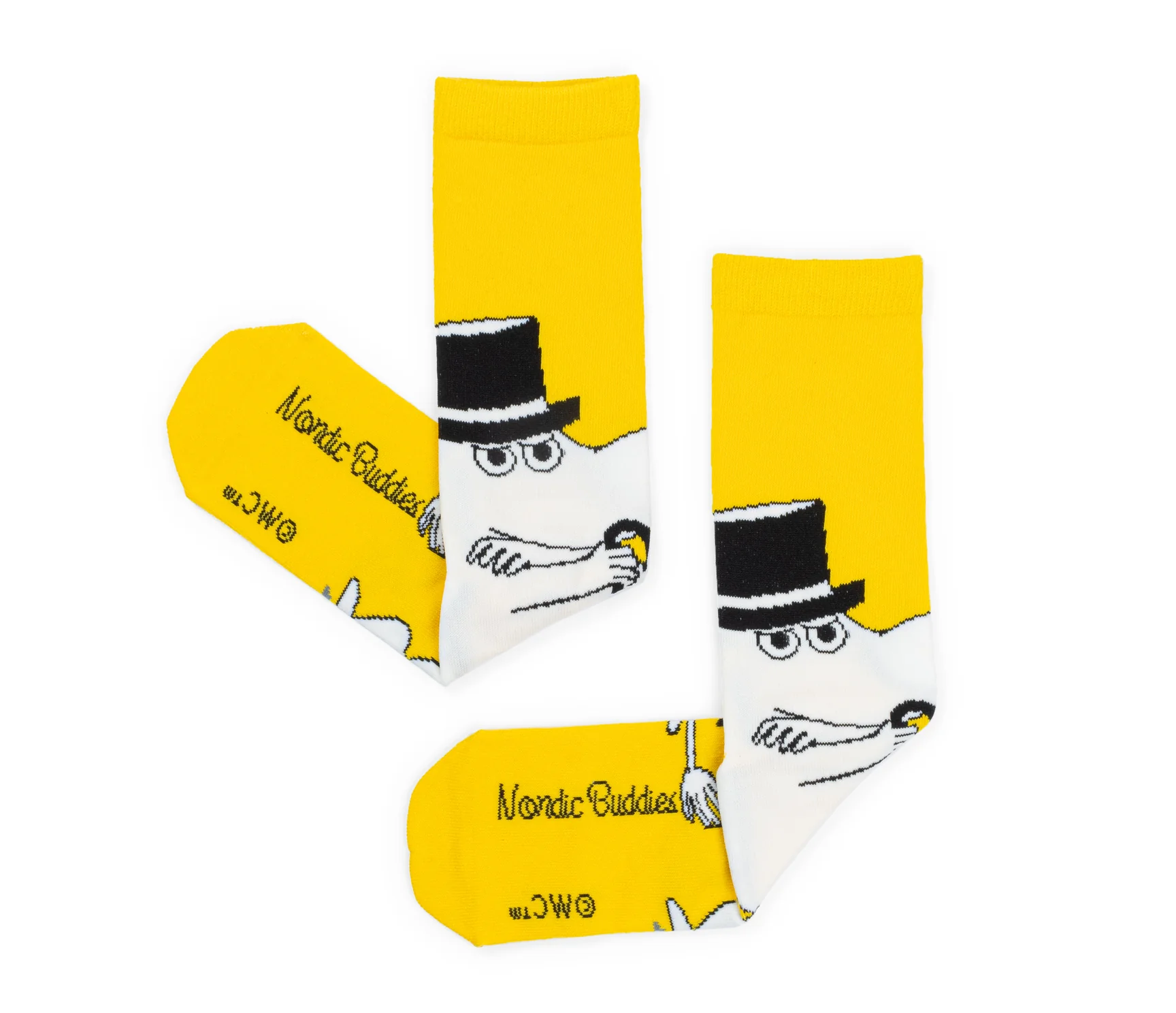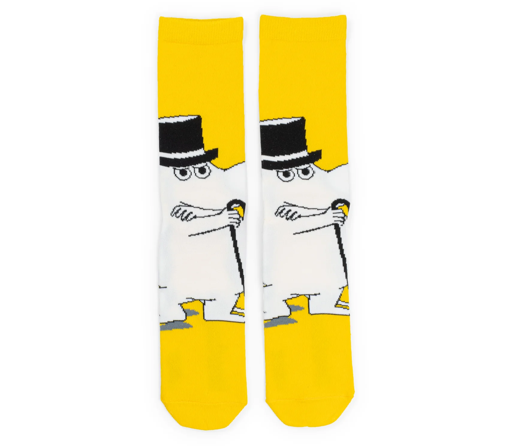 Skarpety są w kolorze żółtym. Na całej powierzchni skarpety widoczna jest postać bohatera bajki "Muminki"- Taty Muminka