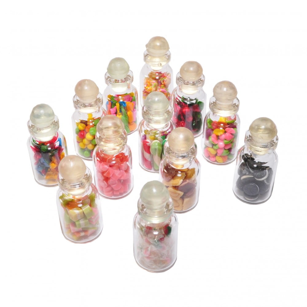 Starannie wykonana miniatura słodyczy w szklanym słoiku. Słoik jest zamykany na gumowy korek imitujący piaskowane szkło. Korek można wyjmować.