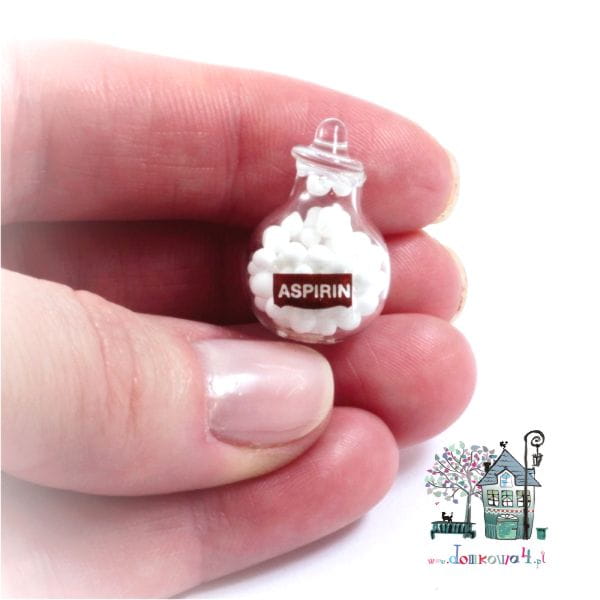 Miniaturowa imitacja tabletek aspiryny w szklanym pojemniku. Wieczko jest przyklejone.