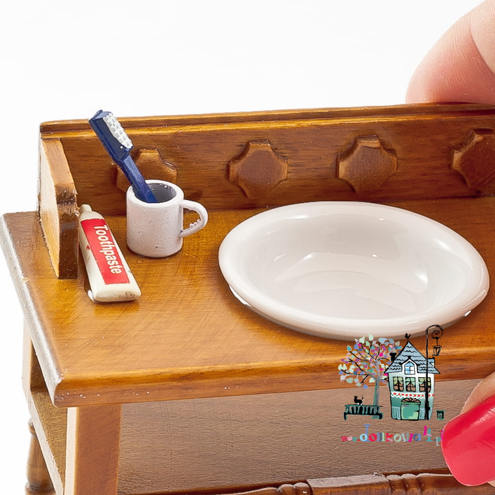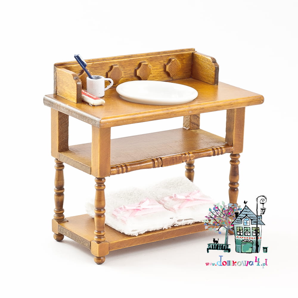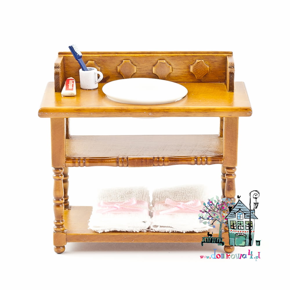 Miniaturowy stolik, umywalka z przyborami do mycia. W komplecie dwa białe ręczniki z różowymi kokardkami, porcelanowa misa umywaliki i przybory do mycia zębów. Całość starannie wykonana i polakierowana.