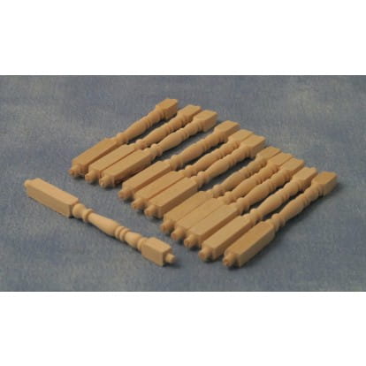 Drewniane, surowe tralki wykonane z jasnego drewna liściastego. Tralki w dolnej części mają podstawę kwadratową o boku 6 mm z delikatną wypustką o długości 2 mm. W komplecie 12 szt.