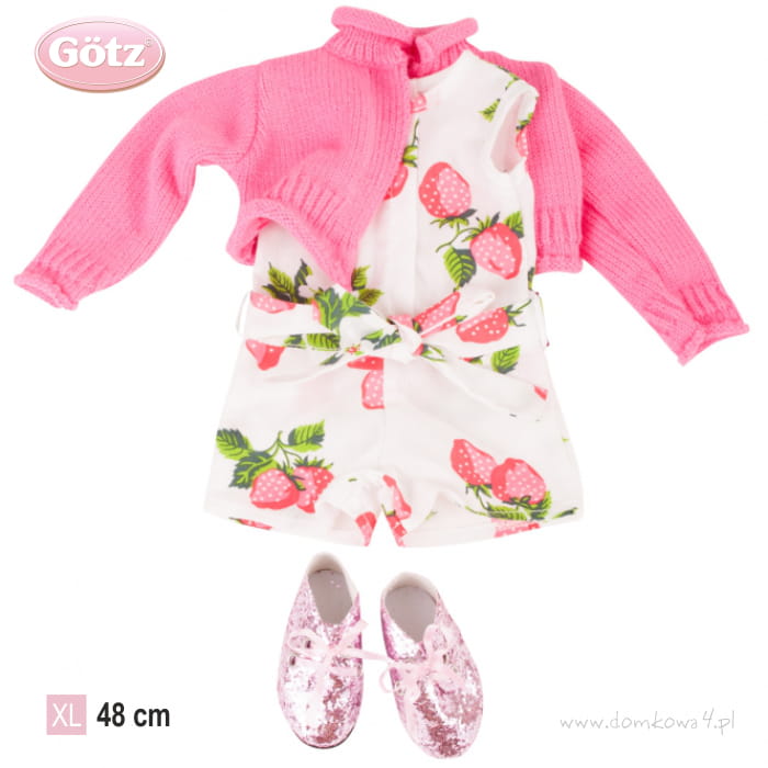 Na komplet składa się różowy sweterek, materiałowa sukienka oraz brokatowe, wiązane baleriny w kolorze różowym. Do kompletu dołączony jest plastikowy wieszak na ubranko. Komplet pasuje na lalki w wysokości 45- 50 cm.
