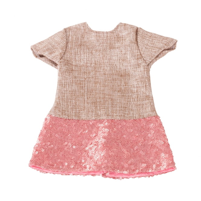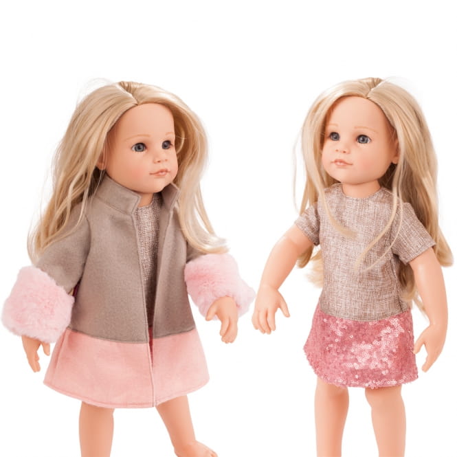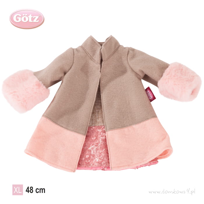 Na komplet składa się materiałowa sukienka ozdobiona ceki nowym pasem i miękki, pluszowy płaszcz z futerkowymi rękawami. Całość utrzymana w eleganckim tonie. Do kompletu dołączony jest plastikowy wieszak na ubranko.