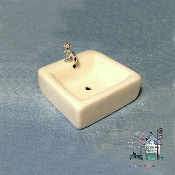 Miniaturowa, współczesna umywalka kwadratowa. Umywalka jest przeznaczona do zamontowania na blacie w łazience miniaturowego domku. Miniaturka wykonana jest z białej glinki i uszlachetniona porcelanową politurą.
