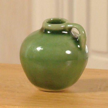 Miniaturowy zielony wazon o pękatym kształcie z niewielkim uchwytem przy boku. Całość wykonana starannie.